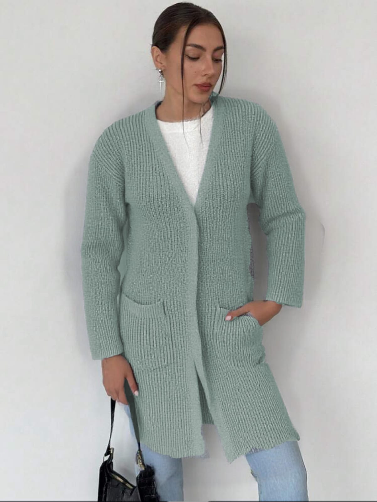 / Long Knitted Cardigan in Fisherman Rib Pocket